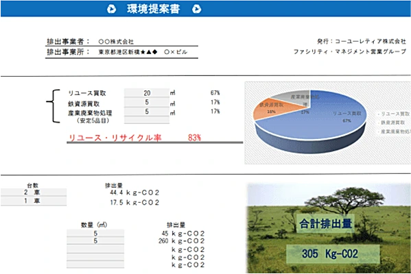 オフィス移転に伴う搬出作業からリサイクル処理の各フローで排出されるCO2を分析・算定し、CO2の量に応じたカーボンオフセットにより、事実上のCO2排出ゼロを達成できます。